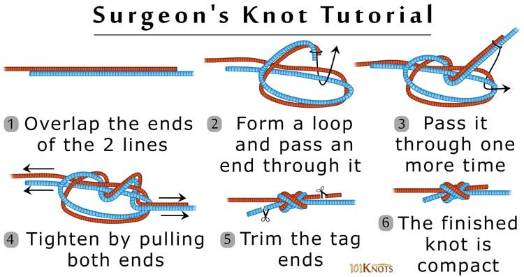 This is also an easy knot for beginners. It is also known to be one of the best and easy to knot for connecting lines of equal or unequal diameter. When taking fishing trips in low light and cold weather instead of the complicated Double Uni Knot choose the simplified Surgeon since the Surgeon knot is used to connect lines with different materials. It is just two simple knots, especially when tied properly, it can reach 100% rope strength if you have practice. Understanding how these knots are tied, first stack the card ends of the two strands connecting four to six inches.