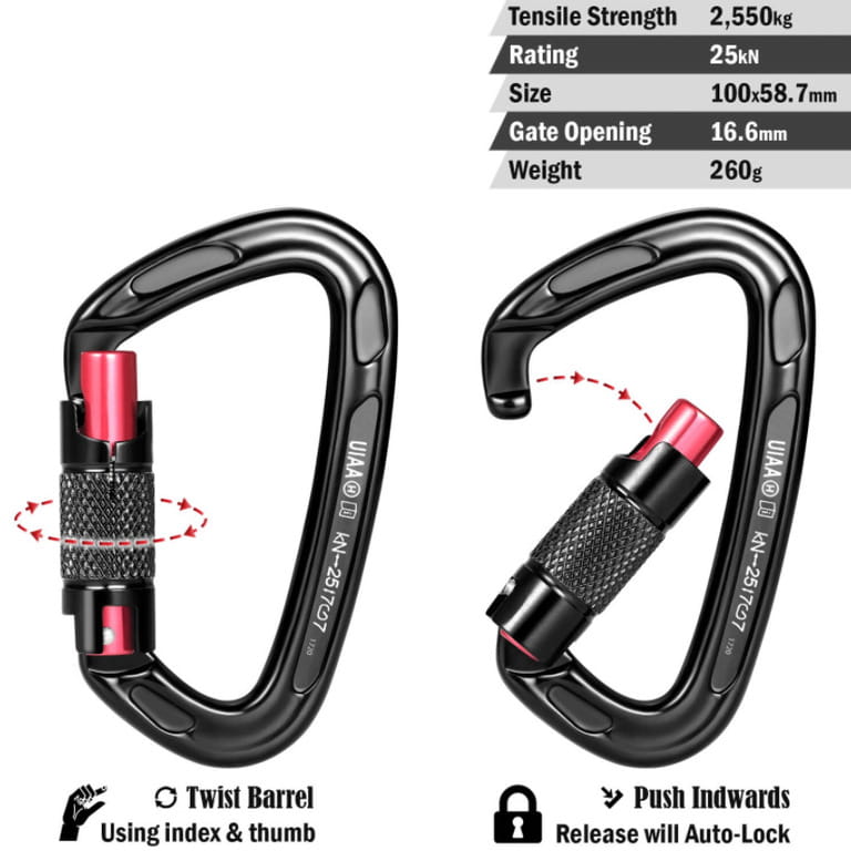 - Automatic locking carabiners: will close automatically and automatically close immediately after opening the gate.