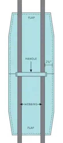 Center the handle, slightly to the right, over the flap seam's right side; the handle should reach 1/2" further than the webbing pieces. Stitch the handle into the flaps along the edges. Make another stitch along the first one for extra stability.