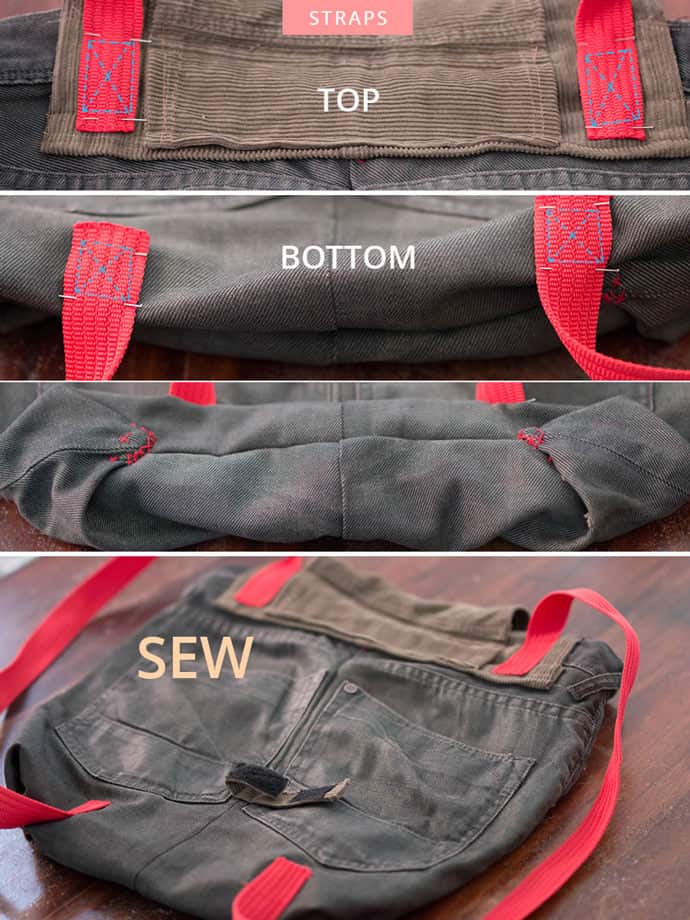 Four double-faced Velcro straps can fasten the pannier to the bike. In order to make the straps more comfortable to wear on your bike, place them right-side up on your rear carrier rack, with their seam in the middle of your carrier rack. Look for the pannier rack under the cloth at least two inches from the raw edge on each side and indicate where the center of the four ropes should be inserted. (The loops on this piece will eventually roll around the rack's side poles when it is facing down.)
