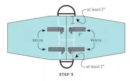Leave three stitches between the Velcro pieces and the stitching markings when you center them on the placement marks "Straps on each side of the centerline are left free so they can be buckled around the pannier rack.