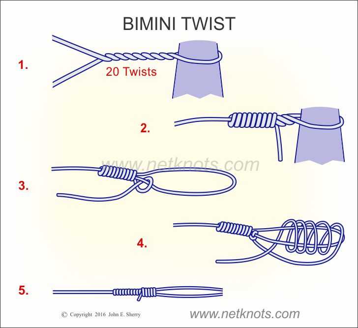 Tie It: The several aspects that the Bimini Twist is related are testament to its humiliation. All has been suggested, including knees, hooks, extra hands and business knots. The animation used the seal to demonstrate the knot, and only used a fraction of the amount of turns needed. While one team recorded positive results with about 12 spins, others have shown that this fails and suggest about 30 monofilament spins and more for braid
