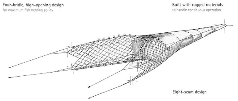 This type of nets is mainly used to target pebbles such as Redbait, Jack Mackerel and Blue Mackerel fishes. They resemble submerged fish nets, except that they are lighter in structure and larger nets with short or absent wings. In addition, most meshes are connected via a long bridle and help the mesh open horizontally. And vertical opening thanks to the buoyancy of the header and weight on the hocks. On the other hand, the position of the mesh is controlled by the length of the warp and by varying the speed of the train.